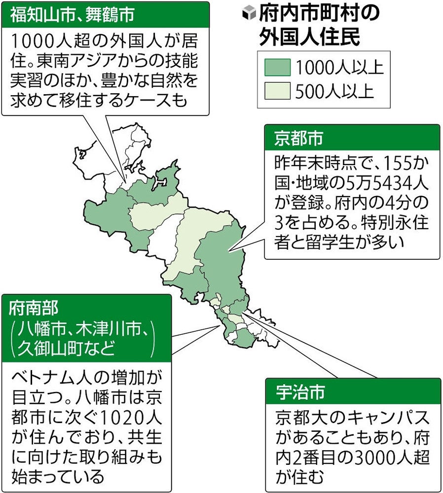 近年目立つのは、府南部での増加だ。府国際課のまとめ(昨年12月時点)によると、人口に占める外国人比率が高いのは久御山町(6・7%)、宇治田原町(5・24%)、京都市(3・85%)、八幡市(3・69%)、井手町(3・67%)の順になっている。多文化共生の動き