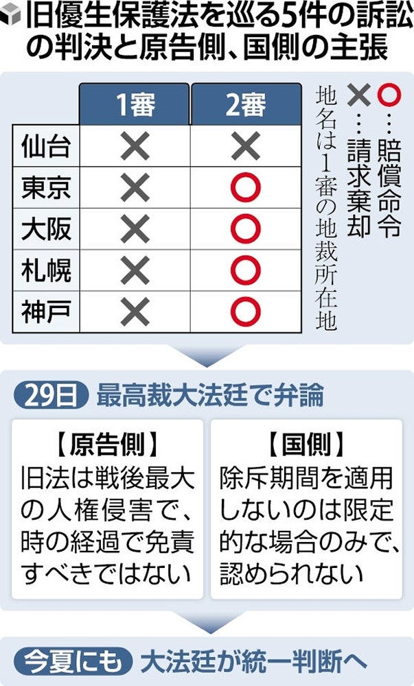 旧優生保護法を巡っては2018年以降、39人が全国12の地裁・支部に訴訟を起こしている。今回の弁論の対象となったのは22年2月~23年6月に仙台、東京、大阪、札幌の各高裁で判決が言い渡された計5件。高裁はいずれも旧法を違憲とし、4件(東京、札幌、大阪2件)では「除斥期間の適用は著しく正義に反する」として国に1人あたり最大1650万円の賠償を命じた。だが、仙台高裁は除斥期間を適用して請求を棄却し、判断が分かれていた。