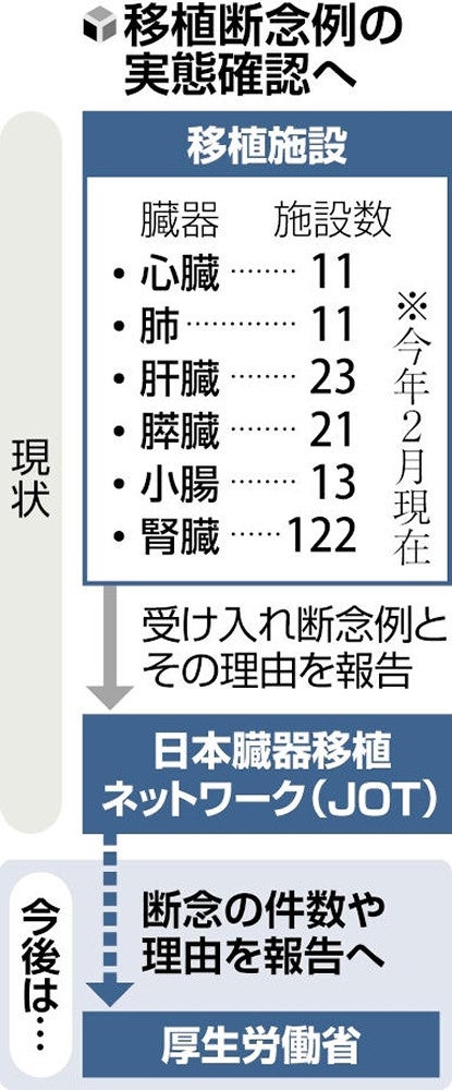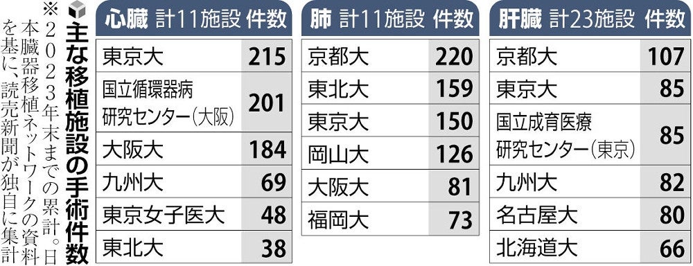 国内の移植施設は2月現在、心臓と肺が各11施設、肝臓が23施設、