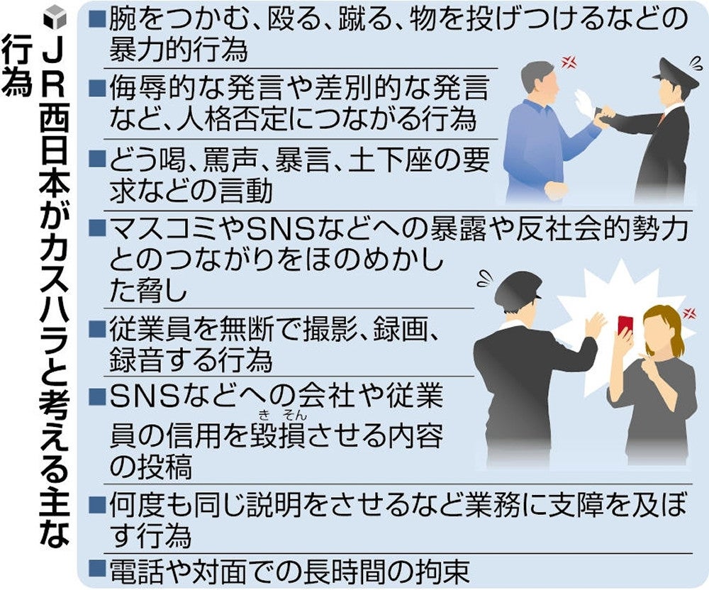 鉄道会社の駅員らが客から暴言や理不尽な要求などを受ける「カスタマーハラスメント(カスハラ)」の被害が深刻化していることを受け、JR西日本などが対応の基本方針を策定した。暴力行為のほか、SNSでの嫌がらせも目立つ。鉄道事業者は「働きやすい環境を損なう」として、そのような乗客にはサービスを行わない方針だ。(林佳代子) 「早くしろ、クズ」。駅の乗り越し精算機のエラー音に対応していたJR西の駅員はある日、利用客から暴言を浴びせられた。状況を確認しようと質問をしたところ、「殺すぞ、ボケ」と激怒されたという。 鉄道業界では列車の遅延などを巡り、カスハラが起きやすいとされる。国土交通省が昨年12月に公表した実態調査によると、2022年度に全国の鉄道会社で1124件が確認された。 駅の窓口で切符の変更を希望した子連れの乗客が、駅員に「対応が遅いから子供がぐずった。フォロワーが多い私のSNSに載せる」と迫った事案などがあった。最多の発生場所は神奈川県(220件)。東京都(178件)、大阪府(173件)と続き、上位3都府県で半数以上を占めた。 暴力行為も後を絶たない。国交省によると、コロナ禍による乗客減で一時減少したものの、22年度は569件となり、21年度(435件)から増加に転じた。事案の半数以上で客が飲酒状態で、ある鉄道会社では駅員が額を3回殴られ、全治約2週間のけがを負った。◎ カスハラは列車の運行や駅業務に支障を及ぼすだけでなく、職場環境が悪化して従業員の離職につながりかねないとして、鉄道事業者は対応策を講じている。 JR西は昨年7月、個人の特定を避けるため、運転席や駅窓口でのネームプレートを廃止。今年4月には、カスハラ対応の基本方針を策定。該当事例として▽腕をつかんだり物を投げつけたりする暴力行為▽土下座の要求――などが確認された場合、サービスを中止することなどを盛り込んだ。 JR東日本も4月に同様の対応方針を公表。全国72の鉄道会社が加盟する一般社団法人「日本民営鉄道協会」は昨年12月、業界が一丸となってカスハラ撲滅に取り組むための基本方針をまとめた。