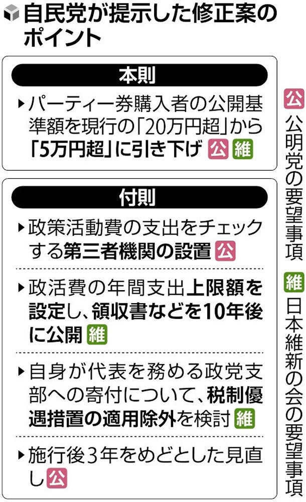 自民が示した修正案は、公明の要望事項のうち、〈1〉政治資金パーティー券購入者の公開基準額の「5万円超」(現行「20万円超」)への引き下げ〈2〉政党が議員に支出する政策活動費(政活費)の支出などをチェックする第三者機関の設置――などを盛り込んだ。維新が要望していた政活費の改革では、年間支出の上限額を定めることや、10年後に領収書などを公開する仕組みを早期に設けることを明記した。