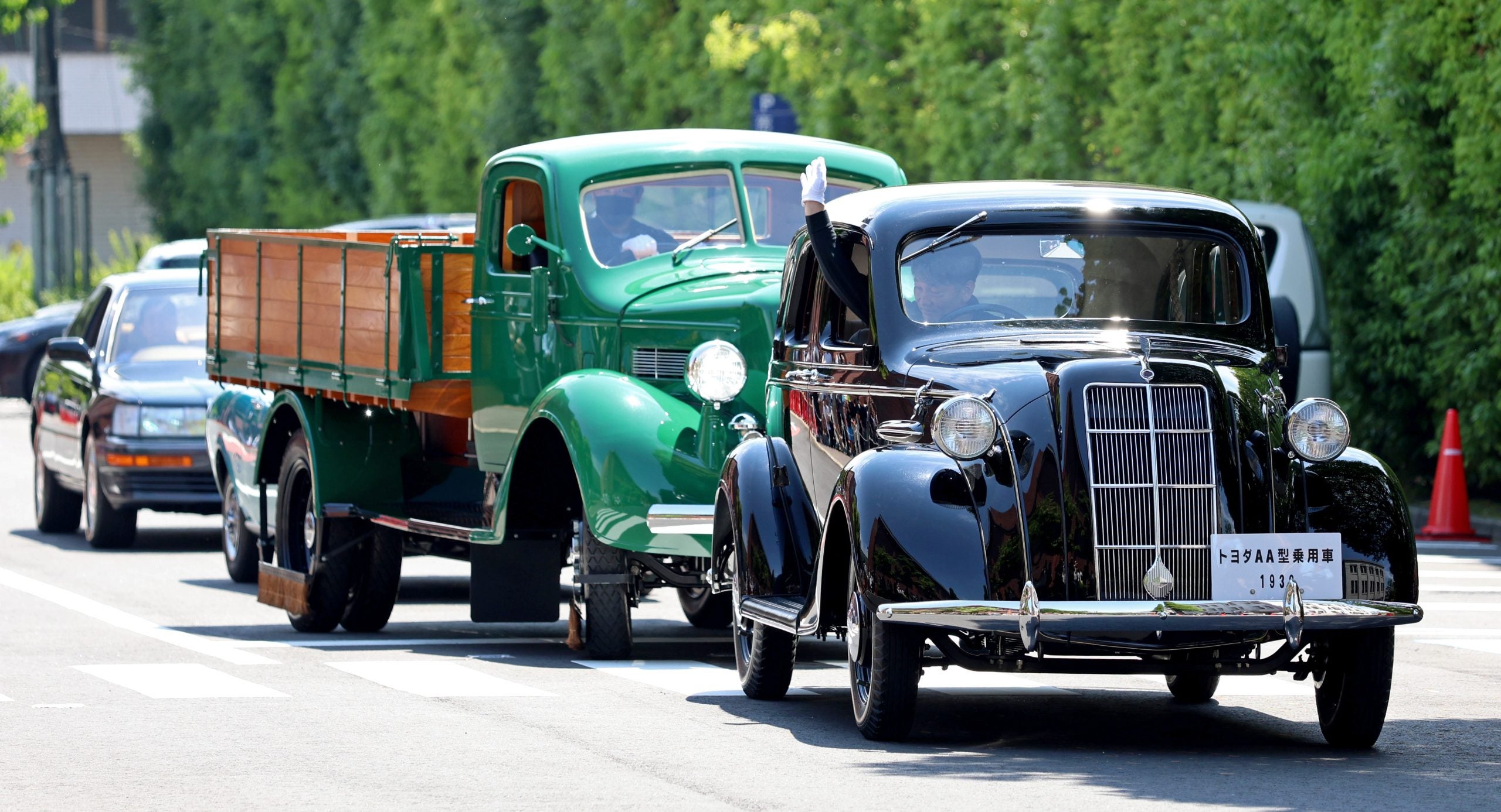 同館の開館30周年イベントの一環で、普段は館内に展示している複製の車両などが走りを披露。前身の豊田自動織機製作所が作り、1935年に発売されたトヨタ初の車「トヨダG1型トラック」や36年発売の初の乗用車「トヨダAA型乗用車」の複製のほか、初代のセリカとセルシオも登場した。