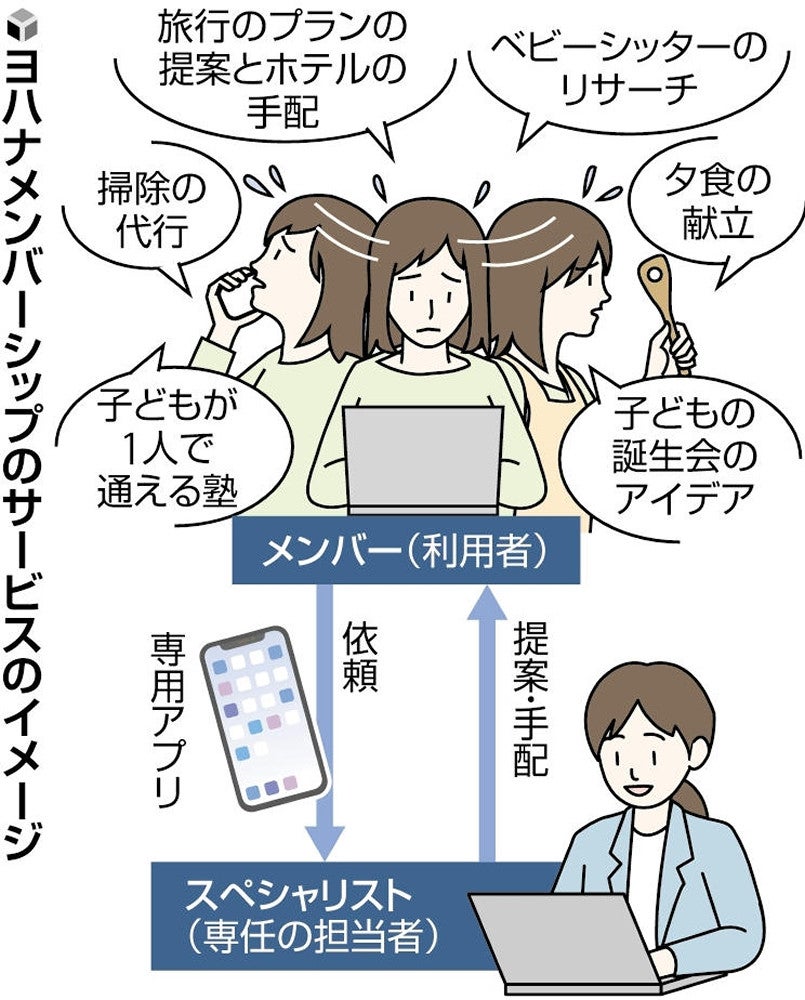 子会社の「Yohana(ヨハナ)」(横浜市)が手がける「ヨハナメンバーシップ」。専用アプリを通じ、夕食の献立の提案やレストランの予約、旅行プランの作成といった困り事を依頼すると、専任の担当者が解決に向けた調査や手配を行う。料金は月1万円(税込み)で、何度も依頼できる。