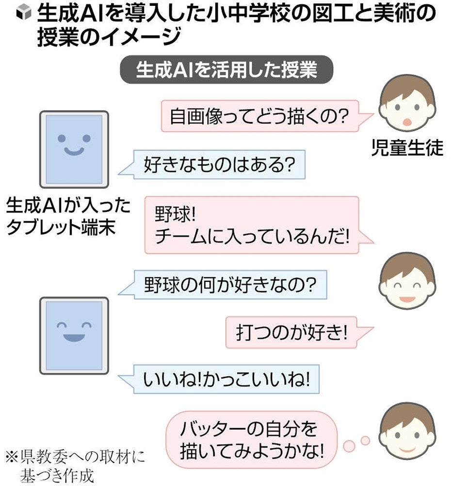 県教委によると、小学校では教員免許が科目ごとに分かれていないため、図工に関しては教員の指導力の差が大きい。中学校の美術については専門の免許を持っている教員が少ないという課題がある。 県教委は「教員が主観に基づいて指導すると、子どもが自分で考えて制作できなかったり、作品の見栄えを優先して制作過程をおろそかにしたりする可能性もある」と懸念。生成AIの活用で、適切な指導のあり方を教員が学ぶことも期待している。 県は、タブレット端末で著名な画家や作品を学べる「デジタルドリル」などと合わせた事業費5000万円を今年度一般会計補正予算案に盛り込み、開会中の県議会に提出している。可決されれば、2学期から公立小中学校約10校で試験導入し、効果を検証しながら各校に広げていく考えだ。 一方、様々な著作物について学習する生成AIを巡っては、著作権を侵害するリスクも懸念されている。県教委は、今回導入予定の生成AIは画像を提示せず、文章のみでやりとりする点などから著作権侵害のリスクは低いとしつつ、「開発業者と相談しながらシステムを作っていく」とする。また、国語や算数といった他の科目への導入も視野に入れているという。 県教委総務課は「作品の完成度や技能、知識の習得ばかりを求めるのではなく、子どもの思考を深められる授業にするための支援にしたい」としている。