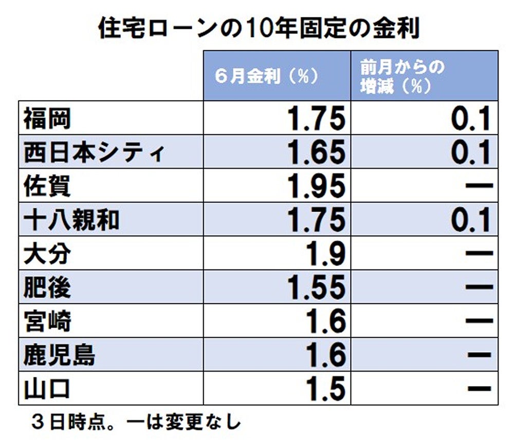 九州・山口の主要地方銀行が3日までに公表した6月の住宅ローン10年固定金利は福岡、西日本シティ、十八親和の3行が引き上げた。日本銀行が3月に大規模な金融緩和策を終えて以降、長期金利の上昇傾向が鮮明になっており、その上昇を反映したとみられる。