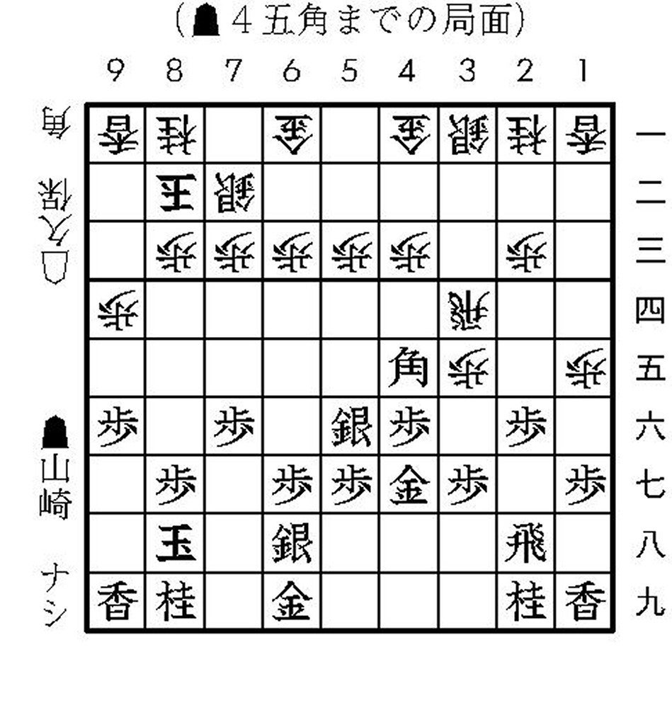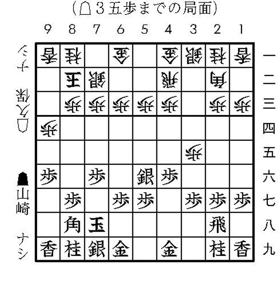 関西対決 1組の準決勝は先に佐藤康光九段が前期挑戦者の伊藤匠七段を破り、決勝進出と本戦への切符を手にした。もう一方の準決勝は関西対決となり、5月1日に関西将棋会館「御上段」で行われた。 本局は、山崎と同じ広島県出身で森信雄七段門下の兄弟弟子、糸谷哲郎八段が解説を務める。まず本局の見所について、「山崎八段は振り飛車に対して穴熊などオーソドックスな作戦を使わず、独自の戦略に出ることが多い。どういった構えを取るのかが序盤の興味深いところではあります」と語る。 対局が始まると山崎は、飛車先の歩を突かずに駒組みを進める。▲4六歩は△4四歩を誘っている節があるが、久保は黙って△8二玉と寄る。 ▲5六銀に△3五歩(途中図)で三間飛車を見せた。△1四歩は様子見で、▲2六歩を見てから飛車を寄りたいところだと糸谷八段は説明する。 後手は角交換から△3四飛と浮いた。先手は無難に▲2五歩や▲6六歩でも一局である。だが、△3二金で石田流が安定すると1五歩型との相性が良いと山崎。実戦はなんと、▲4五角(指了図)と放った。(池田将之)