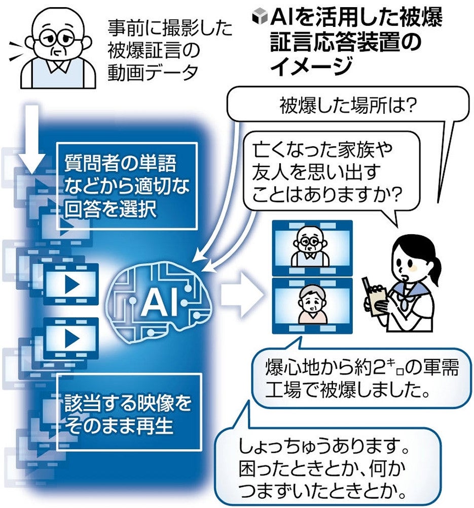 被爆者が高齢化する中、広島市は、被爆者と疑似対話できる「被爆証言応答装置」の製作に乗り出す。事前に撮影した証言映像から、質問に対応した適切な回答を人工知能(AI)が選んで再生し、被爆者とのリアルなやり取りに近づける。広島平和記念資料館(広島市中区)の見学者などに利用してもらう予定で、被爆80年となる来年8月6日までの完成を目指す。 厚生労働省によると、全国の被爆者(被爆者健康手帳所持者)は2022年度末で11万3649人(平均年齢85.01歳)となり、手帳の交付制度が始まった1957年度以降で最少を更新した。全国の人数は、80年度末時点の37万2264人をピークに減少。体験の継承が課題となっている。 広島や長崎では、証言ビデオの活用や、子や孫ら被爆者以外の証言者の育成を進めている。一方で、被爆者と直接話をしたいとのニーズも多く、市は対話を疑似体験できる装置の製作に乗り出すことにした。 装置の根幹となるのは、被爆者の証言だ。あらかじめ様々な質問を想定した回答を用意しておく必要があり、市は今後、5人の被爆者に時間をかけてインタビューを行い、回答映像を蓄積する。
