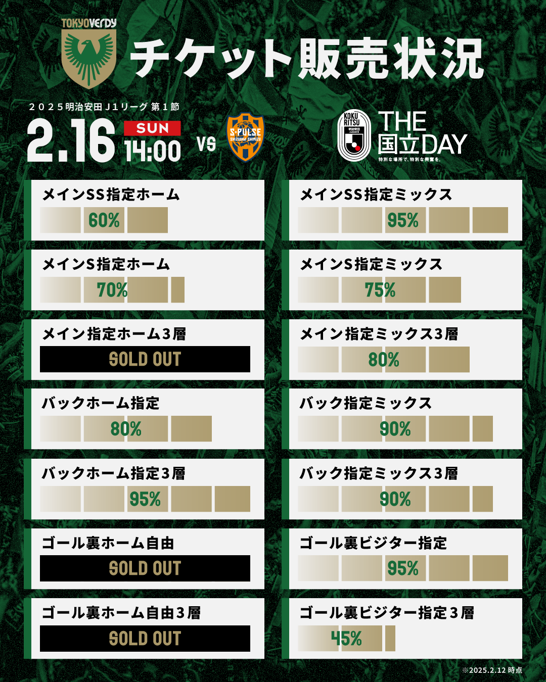 2月16日(日)清水エスパルス戦のチケット販売状況(2月12日 18:00時点)をお知らせします。