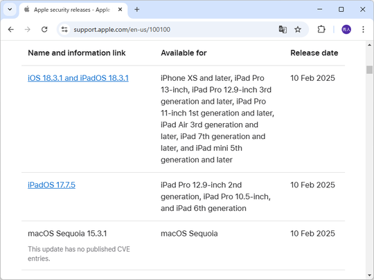 米Appleは2月10日(現地時間)、セキュリティアップデートを実施した。「iOS 18.3.1」、「iPadOS 18.3.1/17.7.5」のほかにも、多くの製品が対象となっている。