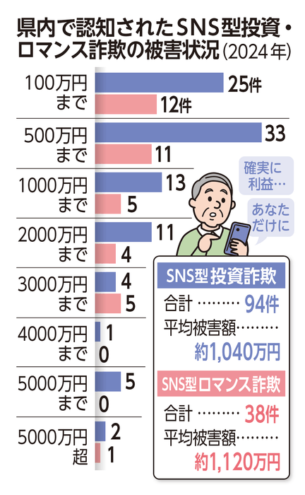 県警のまとめ(暫定値)によると、24年のSNS型投資詐欺の被害件数は94件(前年比86件増)で被害額は約9億7800万円(同約9億4400万円増)。ロマンス詐欺は38件(同3件増)、約4億2500万円(同約1億5200万円増)だった。1件当たりの平均被害額は投資詐欺が約1040万円、ロマンス詐欺が約1120万円。5千万円以上も計3件確認されている。