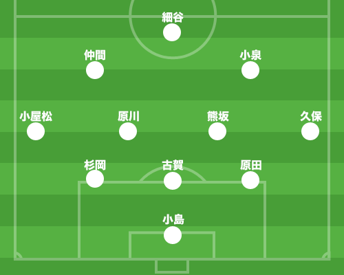 GK小島亨介、DF原田亘、古賀太陽、杉岡大暉、小屋松知哉、MF熊坂光希、原川力、久保藤次郎、仲間隼斗FW細谷真大、小泉佳穂