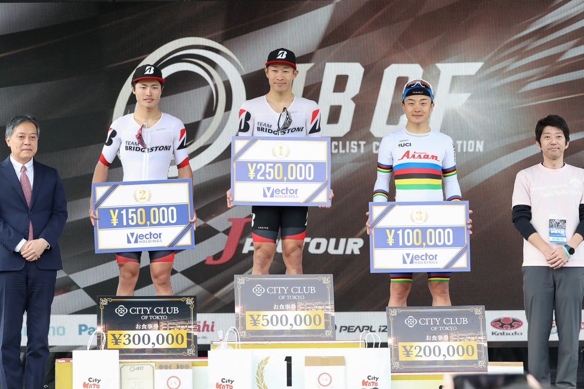 その直後、松田祥位(ブリヂストン)が抜け出して単独先行を開始。「集団が牽制して緩んだところで後方から飛び出した」と松田が言うように、一瞬追走が遅れた集団との差が一気に広がる。後方から窪木や岡篤志(宇都宮ブリッツェン)が追いすがるも、数秒差を詰めきれないまま残り100mの最終コーナーへ。松田はおよそ1周を逃げ切ってフィニッシュ。2位には岡本勝哉が続き、ブリヂストンが1-2フィニッシュを決めた。