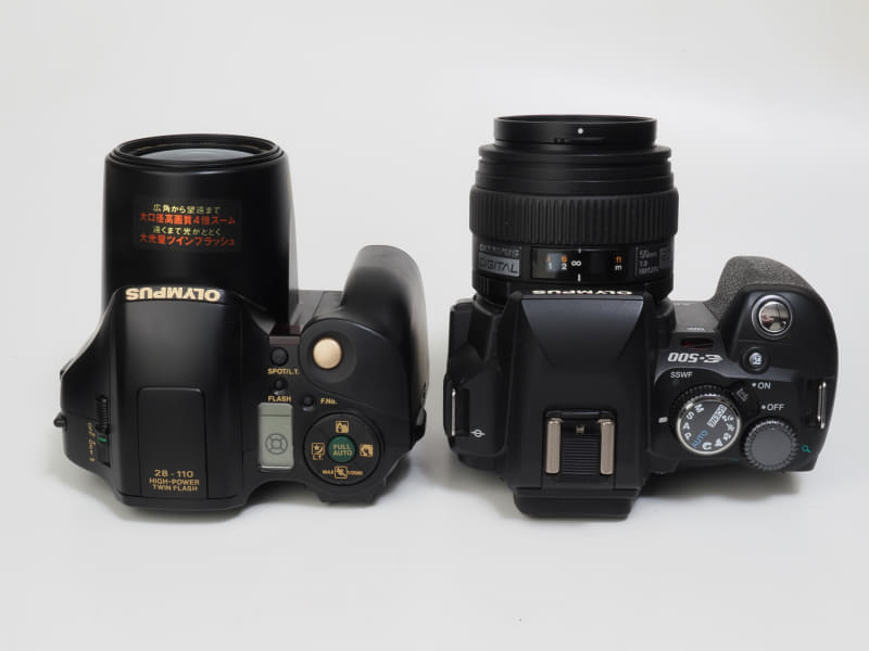 E-500とL-10スーパーを並べてみるとこんな感じです。お互いの誕生年は10年ほどの差がありますが兄弟みたいじゃないですか。L-10ズーパーのサイズのままデジタル化はできなかったんですかね。