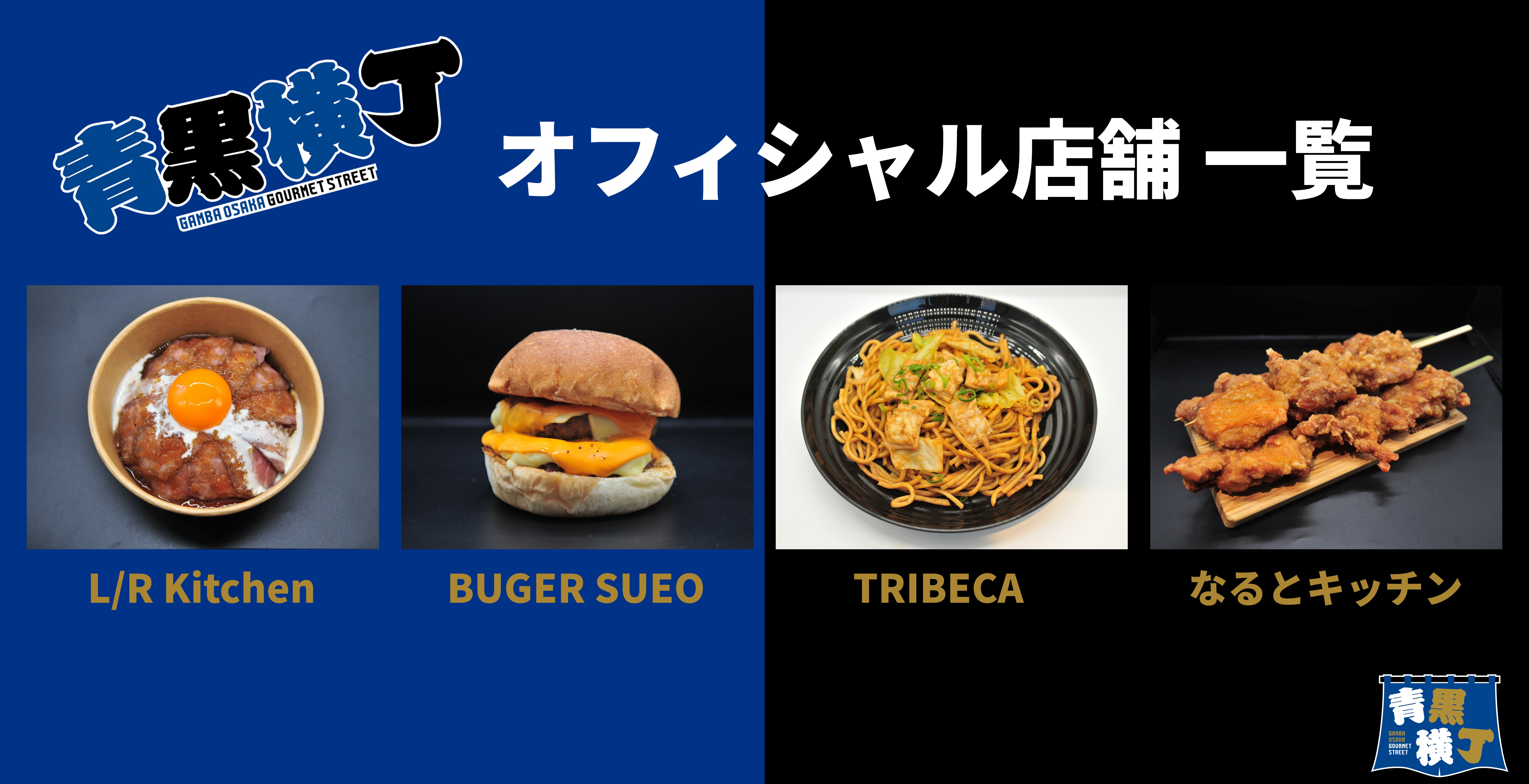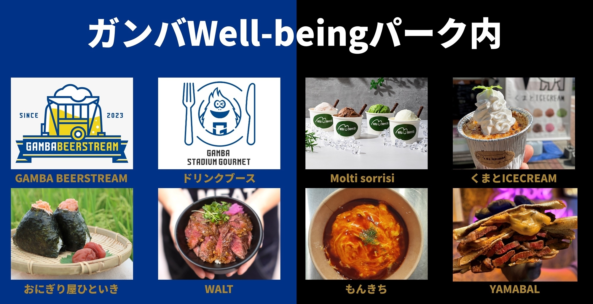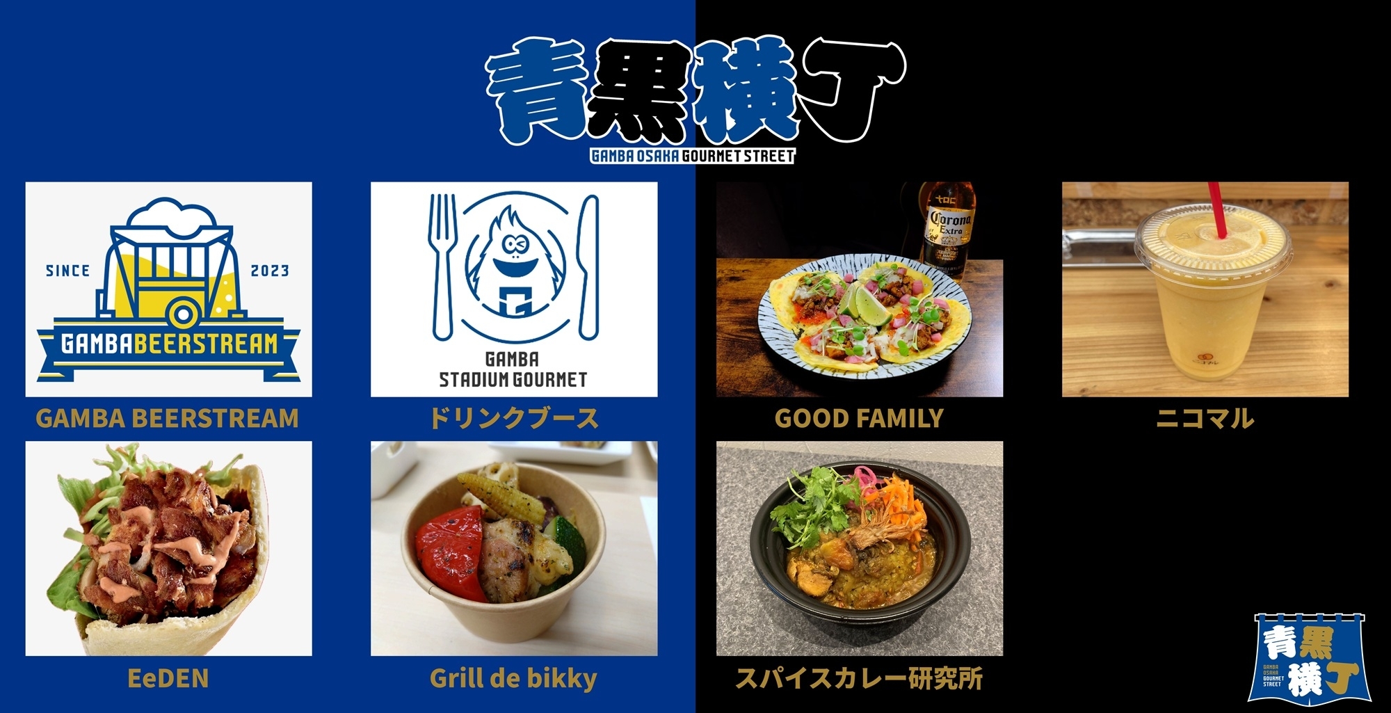 青黒横丁(バックスタンド側広場)11店舗、ガンバWell-beingパーク(メインスタンド側広場)7店舗 合計18店舗が出店します。