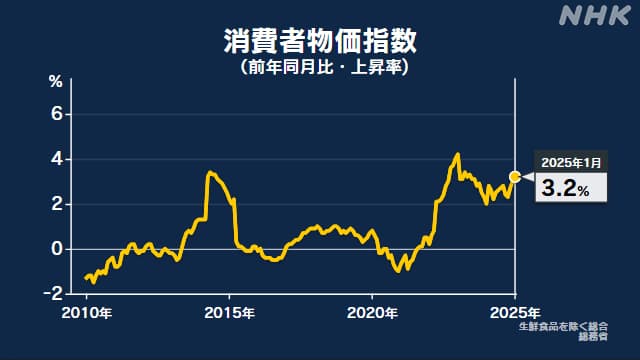 総務省によりますと、1月の消費者物価指数は、生鮮食品を除いた指数が2020年の平均を100として109.8となり、去年の同じ月より3.2%上昇しました。上昇率は前の月・12月の3.0%から0.2ポイント拡大し、2か月連続の3%台となりました。
