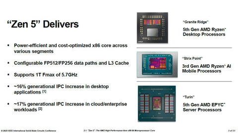AMDは最新のCPUコア「Zen 5」と「Zen 5c」の技術概要を国際学会「ISSCC 2025」で2025年2月17日(米国太平洋標準時)に発表した(講演番号および論文番号2.1)。「Zen 5」と「Zen 5c」はZenアーキテクチャによる第5世代のCPUコアであり、過去の世代と同様にCPUコアの数や種類を変更することで、モバイル(クライアントのノートPC)向け、デスクトップ(クライアントのデスクトップPC)向け、サーバー向けへとプロセッサ製品を展開している。