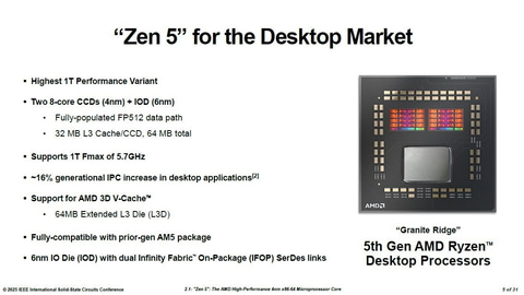 デスクトップ向けの「Zen 5」世代プロセッサ「Ryzen Desktop Processors」の概要。AMDがISSCC 2025で公表した講演スライド(講演番号2.1)からサーバー向けはZen 5コアのミニダイとZen 5cコアのミニダイを個別に用意
