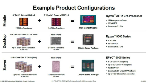 CPUコア「Zen 5」と「Zen 5c」を搭載するプロセッサ製品の展開。右上はデスクトップ向け(開発コード名は「Granite Ridge」)、右中はモバイル向け(同「Strix Point」)、右下はサーバー向け(同「Turing」)のパッケージ外観(製品ではシリコンダイを見えないように封止している)。デスクトップ向けとサーバー向けはチップレット構成(演算用ミニダイ「CCD」と入出力用ミニダイ「IOD」で構成)、モバイル向けはモノリシックのシングルダイであることが分かる。AMDがISSCC 2025で公表した講演スライド(講演番号2.1)から