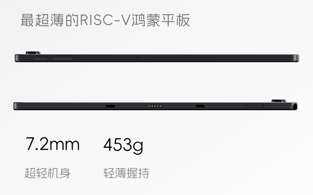 スペックは、SoCに8コアRISC-VのSpacemiT K1、10.95インチ(1920×1200)IPSディスプレイ、8GB/16GB LPDDR4x RAM、128GB/256GB eMMCストレージ、リア13MPフロント8MPカメラ、OpenHarmony 5.0、7,000mAhバッテリーという構成。