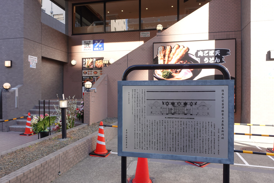 資さんうどん両国店1階入口前の看板によると、この一帯は江戸時代に「津軽藩(弘前藩)上屋敷」があったそうだ。