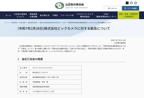 公正取引委員会(公取委)は28日、下請代金支払遅延等防止法の第4条第1項第3号に基づき、ビックカメラに勧告を行なった。