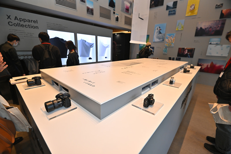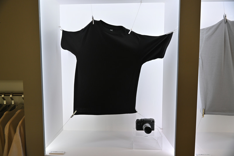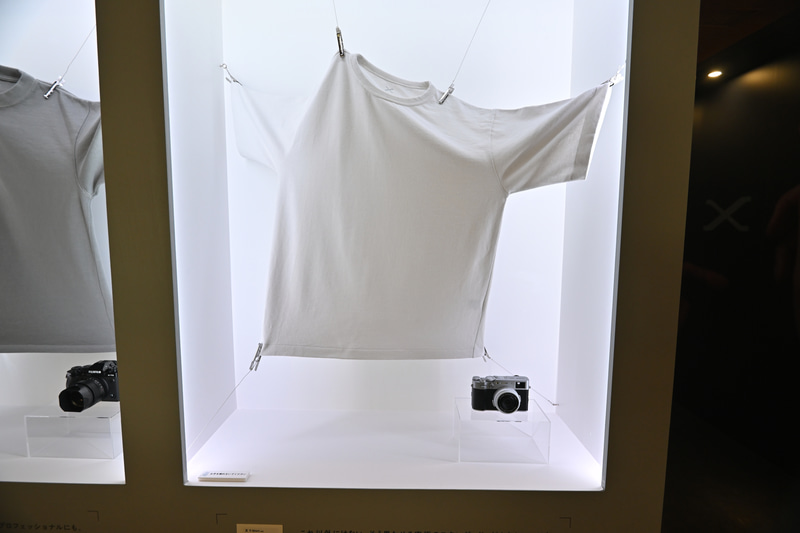 ライフスタイル提案として「Xアパレルコレクション」をお披露目。Xロゴ入りオリジナルTシャツ(1万4,850円・税込)を店内限定で予約販売する。人気の高い3機種をそれぞれモチーフにしたデザインで、「X-Proシリーズ」は黒を基調に白いステッチを入れたタイトめのシルエット、「Tシリーズ」は白と黒の中間のグレーでカジュアルかつモード感のあるデザイン、「100シリーズ」は白で日常使いしやすいボックスシルエットに仕上げている。