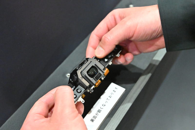 シャッター音やダイヤル操作感を比較体験できるコーナーでは、実際に触れて操作できるよう「X-Pro3」「X-T5」「X100VI」が展示されている。通常は公開されない内部構造を見せる「カットモデル」も用意。