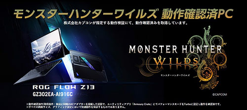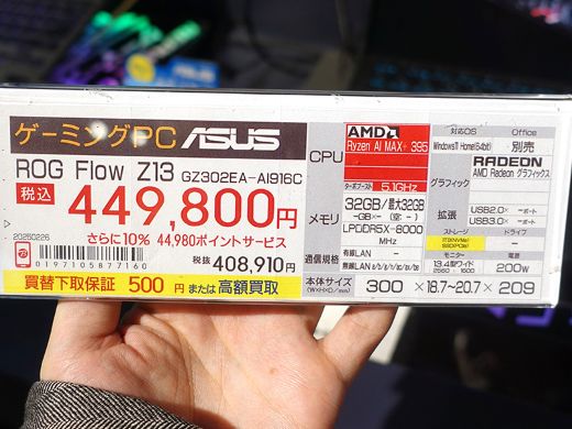 ソフマップAKIBA パソコン・デジタル館に入荷したモデルは、Ryzen AI MAX+ 395/32GBメモリ搭載の「GZ302EA-AI916C」で、店頭価格は449,800円(10%ポイントサービス対象)。ASUSは「モンスターハンターワイルズ 動作確認済PC」とアピールしている。