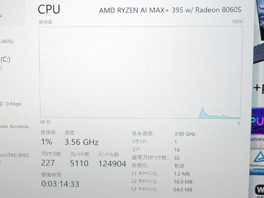 入荷したROG Flow Z13 GZ302EA-AI916Cの主な仕様は、16コア/32スレッドのRyzen AI MAX+ 395、Radeon 8060S(40コア/CPU統合)、32GB LPDDR5X-8000メモリ、1TB SSD、Windows 11 Home。