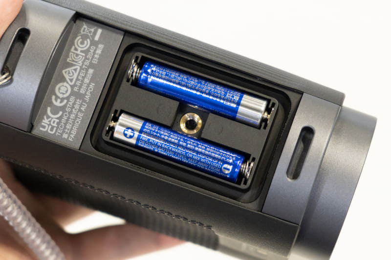 入手性の良い単4電池×2を使用し、上面の回転スイッチで防振機能を動作させる。動作ボタンを押し続けるといった必要が無いため、比較的楽に見ることができる。
