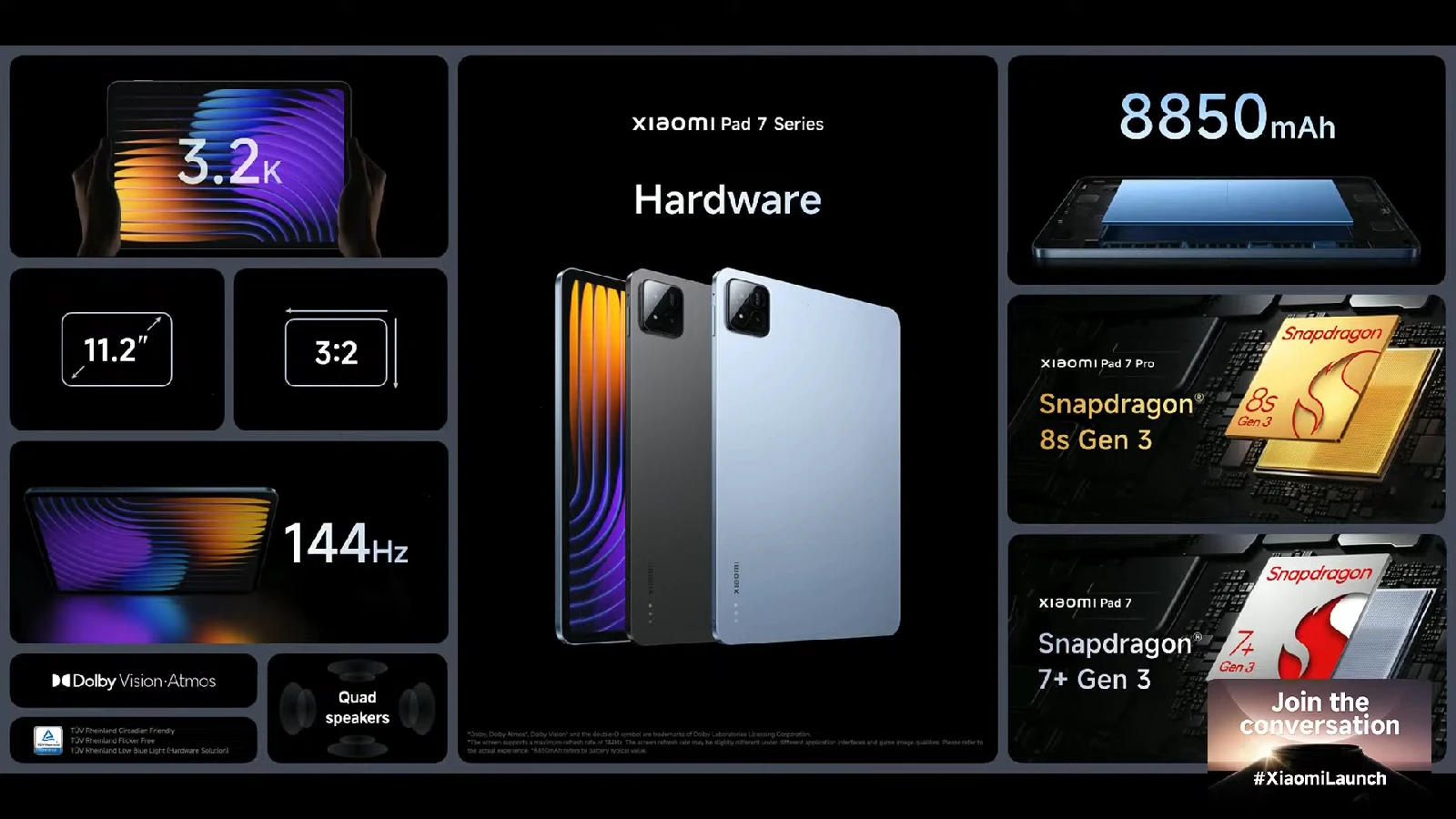 両者の違いは CPU とカメラで、Xiaomi Pad 7 には Snapdragon 7+ Gen 3 プロセッサ、Xiaomi Pad 7 Pro には Snapdragon 8s Gen 3 プロセッサが搭載され、どちらも 8GB または 12GB RAM、ストレージは 128GB、256GB、512GB が用意されています。