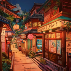 2023年6月にMidjourneyが生成した「千と千尋の神隠しっぽい風景」。ソレっぽいのだが、商店の看板に謎の文字が書かれている。気持ち悪っ!