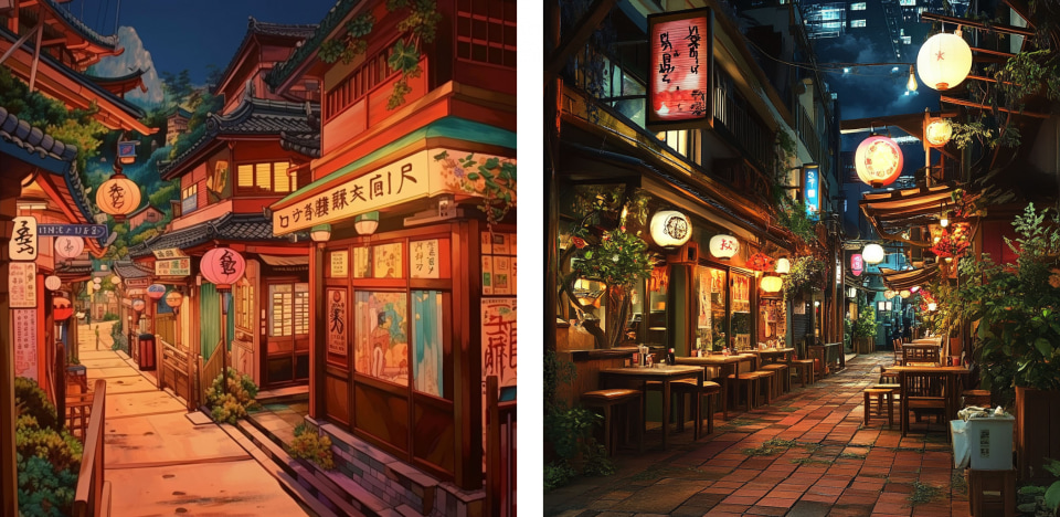 余談だが、左が2023年6月に生成したもので、右が2025年3月頃に生成したもの。どちらも同じプロンプトを使っているが、総じて現在の最新バージョンのMidjourneyは「より強い臨場感と繊細な光量で描画している」と感じられる。でも街の中の看板などは、相変わらず謎の文字だ。