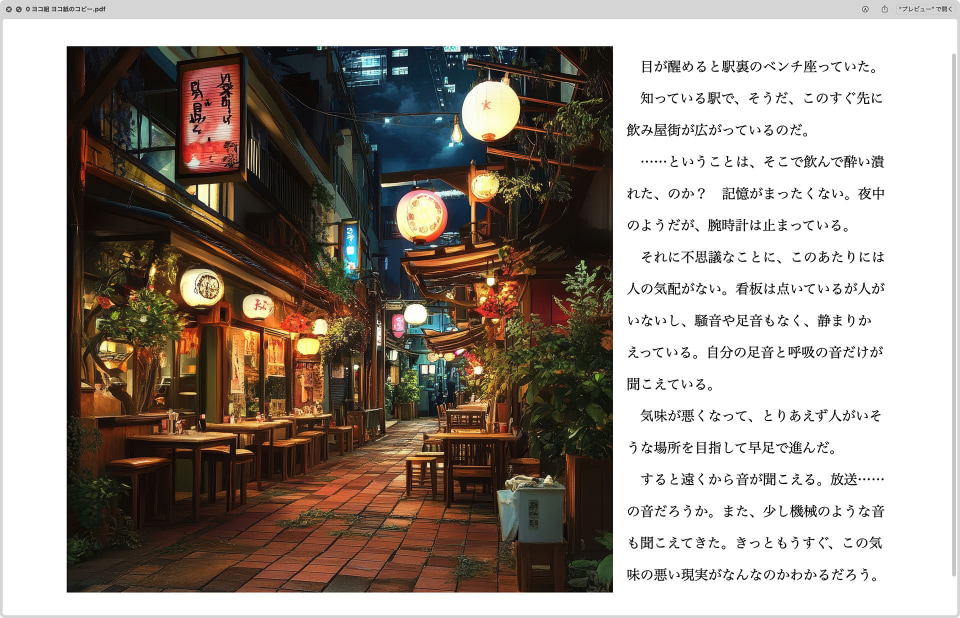 創作物の例。AI生成の背景、オブジェクトなどをコラージュしつつレタッチし、それに短い文章を加え、絵本のようなものを作っている。この前段階では小説+挿絵というスタイルだったが、文章に重点が置かれるスタイルで作るのは面倒っていうか進捗が遅いので、「絵とそれを簡単に説明する短い文章だけの絵本みたいな創作物」を作るようになった。1日に20ページくらい作れたりする。使っているアプリはPages(ワープロアプリ)。複数ページのPDF化も容易なので、簡単に絵本のようなものを作れる。なおこの創作物はサンプルのため、AI生成の背景にテキストを足しただけで、人物やオブジェクトの追加、レタッチなどは施していない。……あー誤植! ×「ベンチ座っていた」 ○「ベンチに座っていた」 いや〜サンプルということでさっき急いで作ったものなのでぇ〜