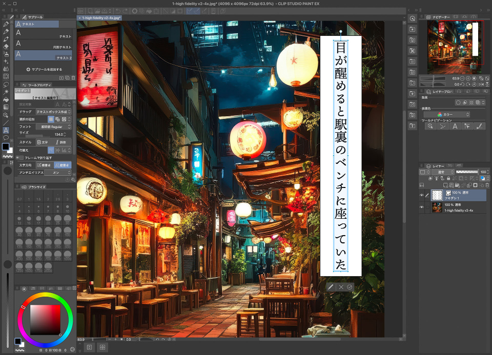 クリスタでのセリフ・文字入れだが、こういう創作物のテキスト挿入機能としては、Photoshopよりも使いやすい気がした。位置移動がクイックでありつつ、文字サイズを慎重・手軽にコントロールできた。さっすがマンガ用!