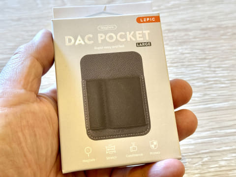 DAC POCKETの特徴はiPhoneのMagSafe機構をそのまま利用して背面に磁石で簡単に取り外しができるということだ。表面には伸縮性に優れたバンドが二組ついていて、大きい方でスティック型DACを挟み込むことができる。小さい方は使用していない時にUSB端子を収納するのに使うことができる。取り外しはMagSafe製品らしく大変に楽だ。取り付け方向に注意すればそう容易には外れない。これは優れものだ。