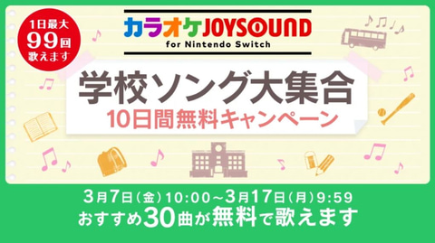任天堂は、Nintendo Switch用カラオケソフト「カラオケJOYSOUND for Nintendo Switch」において、「学校ソング大集合 10日間無料キャンペーン」を3月7日10時より3月17日9時59分にかけて開催する。