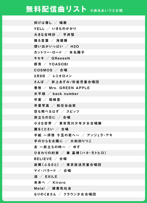 卒業式シーズンにあわせて「カラオケJOYSOUND for Nintendo Switch」の無料開放キャンペーンが実施される。対象楽曲としてはいきものがかりの「YELL」や、YOASOBIの「群青」、レミオロメンの「3月9日」など30曲が対象で1日につき99回、だれでも無料で歌うことができる。。今回のキャンペーンでは学校ソングを取り揃えた楽曲ラインナップとなる。