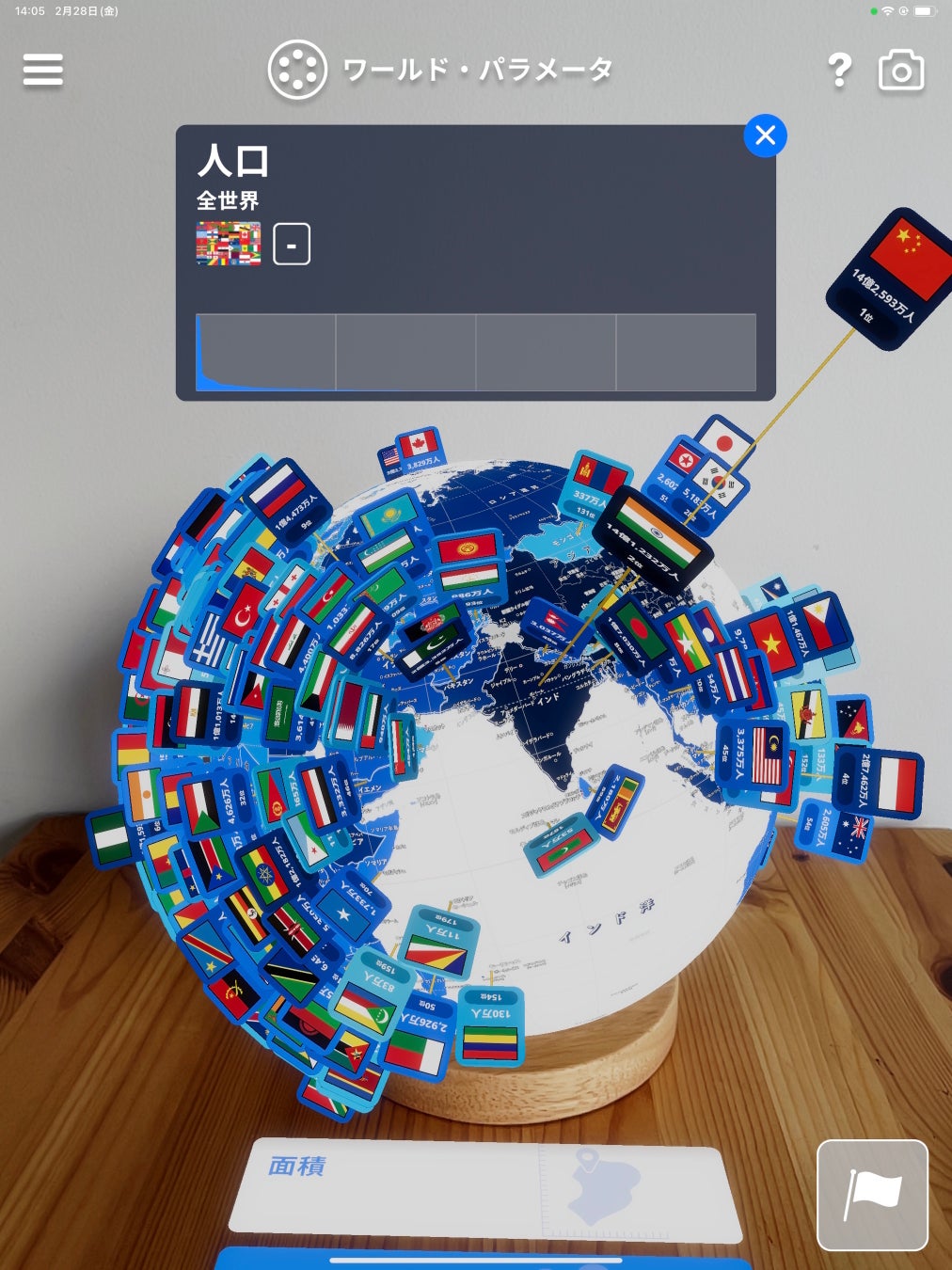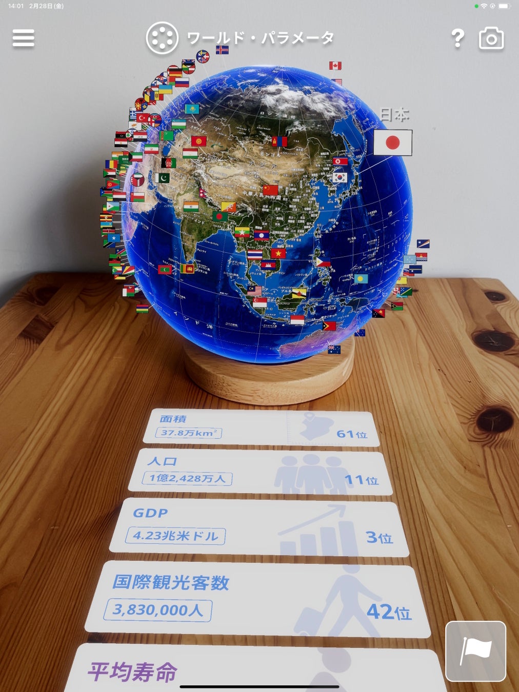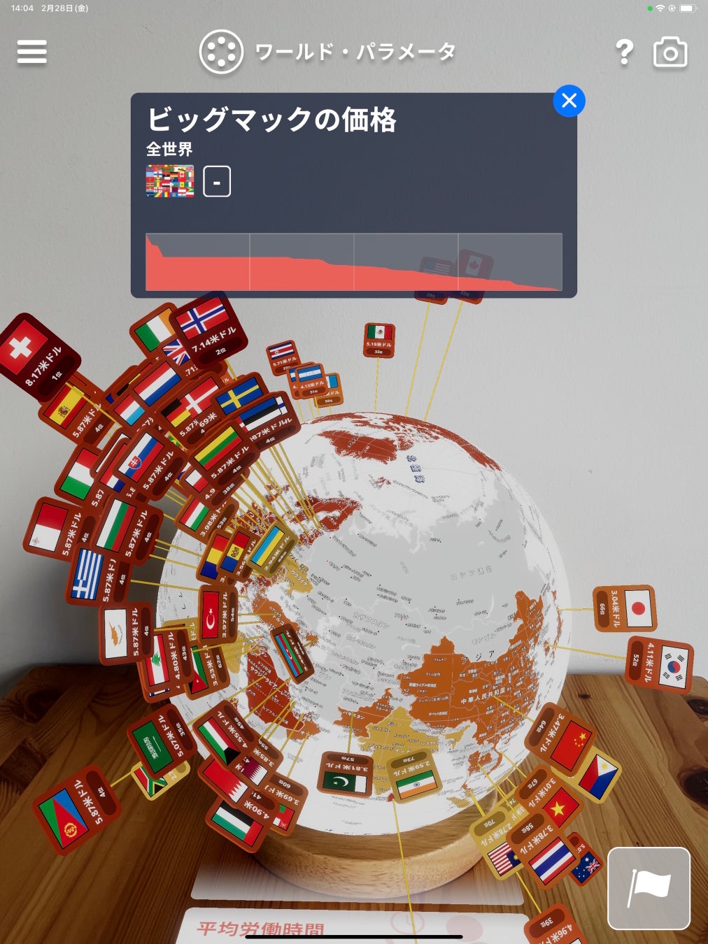 アースボールから飛び出す国旗をタッチすると、手前に出てくるパネルでその国の面積、人口、GDPなど様々なデータが見られます。新アプリでは一人あたりのビール消費量やビッグマック指数など、新しい指標も追加されました。パネルをタッチすれば、その項目での国別ランキングが可視化。人口やインターネット利用率、平均労働時間など、いろいろな項目のランキングを地球儀上で場所を見ながら知ることができます。世界各国のデータや比較がビジュアルで直観的に理解でき、学習ツールとしても使いやすくなりました。