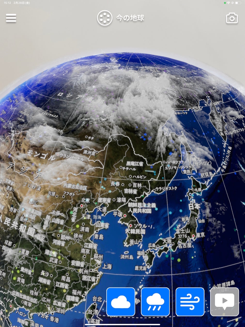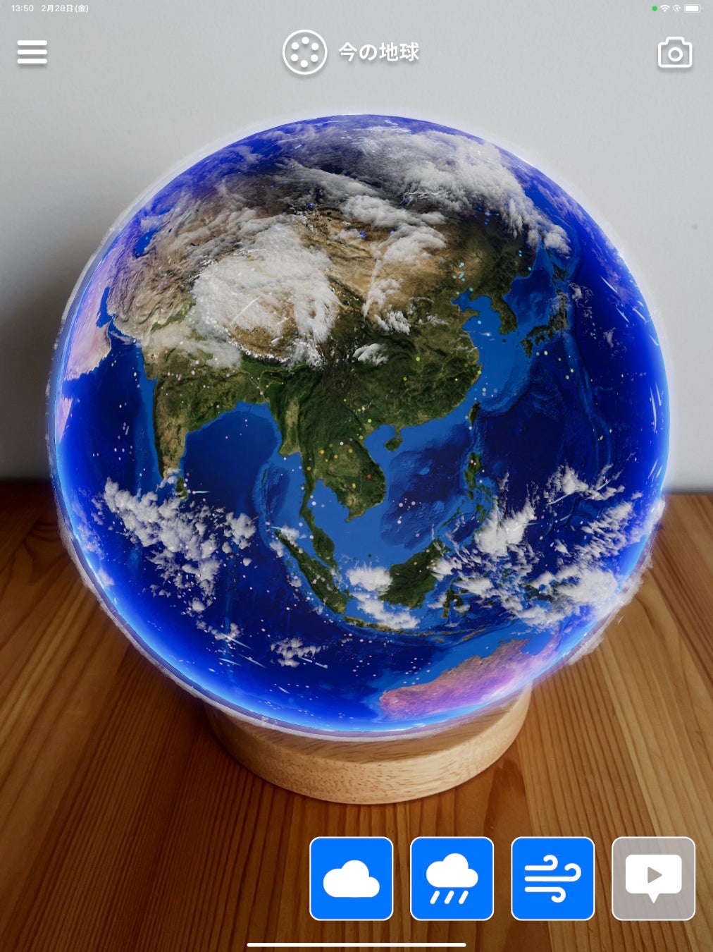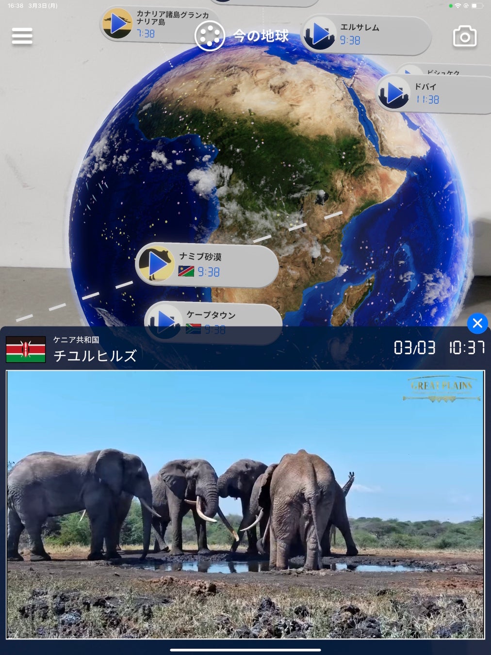 リアルタイムの地球を楽しむことができる人気コンテンツ「今の地球」が、より立体的で美しいビジュアルにアップデート。衛星から取得したデータを30分ごとに更新し、地球上の昼と夜の変化に応じて、最新の雲量、降雨量、風の向きが表示されます。新アプリでは「ライブカメラフィード」が追加されました。サバンナから大都市まで、世界中のいろんな場所に設置されたライブ映像を、アースボール上で楽しむことができます。過去1週間の雲、降水量、気温の変化を、時間の流れとともに楽しめるコンテンツ「一週間の地球」もあります。