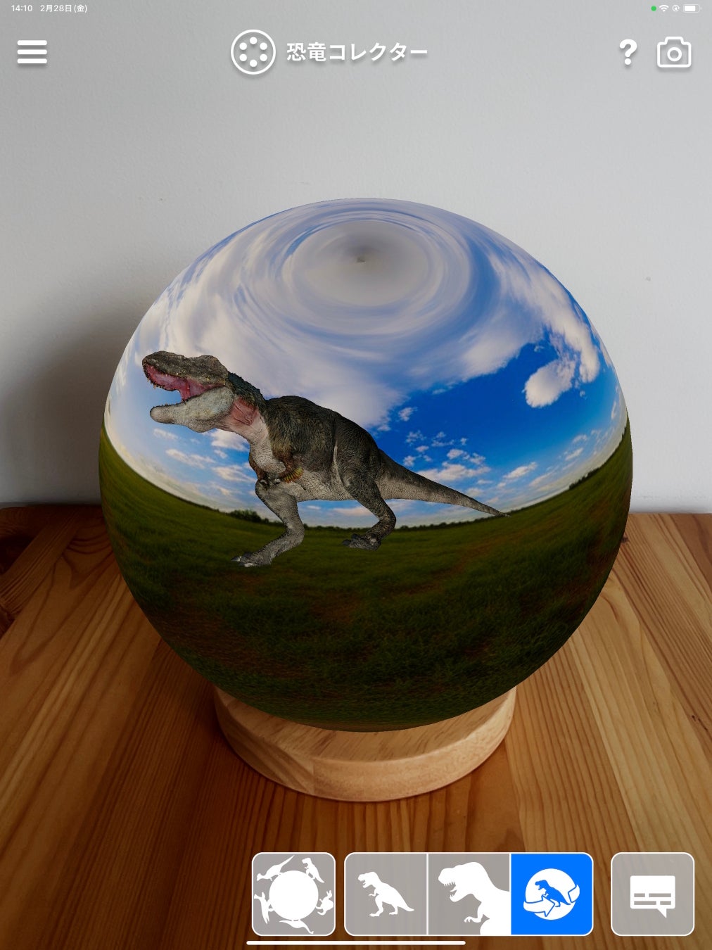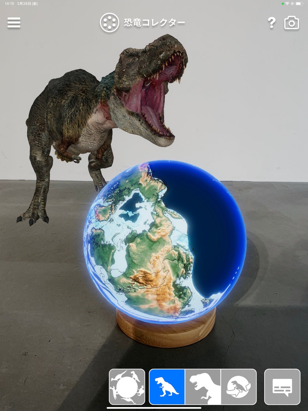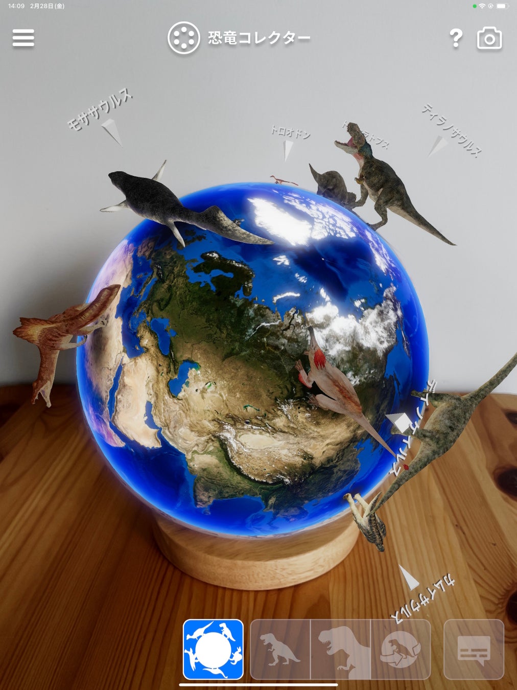 ティラノサウルスやトリケラトプスなど、全8種類の恐竜がアースボールから飛び出して動きます。恐竜を実物大にまでスケールアップさせたり、アースボールの中に入れて眺めたり、大きさを変えながら楽しむこともできます。カメラボタンも搭載しているので、迫力満点のバーチャル恐竜と一緒に記念撮影することも。恐竜学者の真鍋真さんによる最新の恐竜研究に関する情報も、音声解説としてお楽しみいただけます。