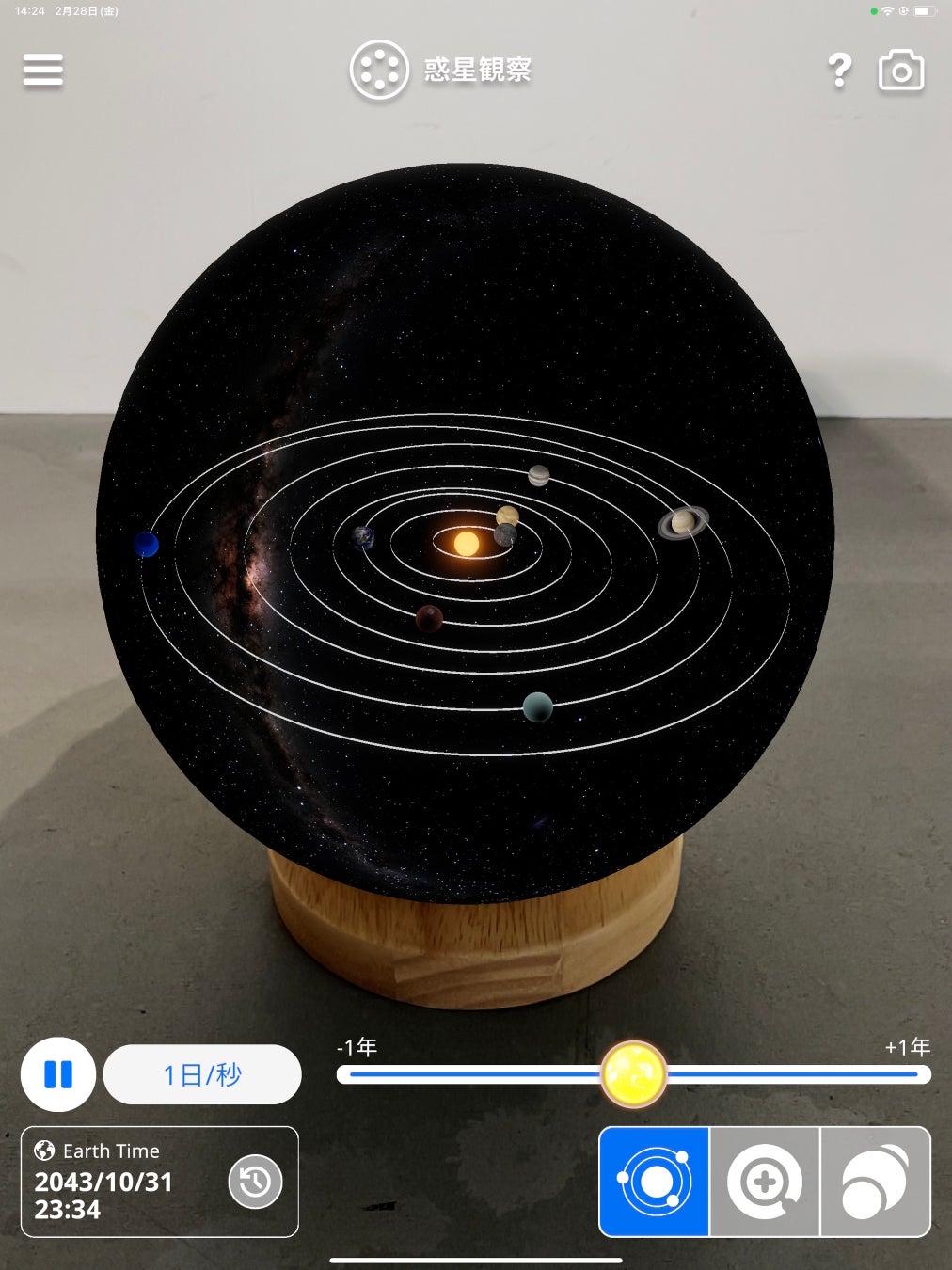 アースボールにアプリをかざすと、太陽を中心にまわる8つの惑星が現れ、宇宙空間が目の前に広がります。惑星同士の距離や大きさを比較したり、自転速度を調整できる機能も搭載。各惑星の音声解説と天文学に関する詳しい情報も用意しています。AR上に広がる宇宙空間で、太陽系を思う存分に観察することができます。