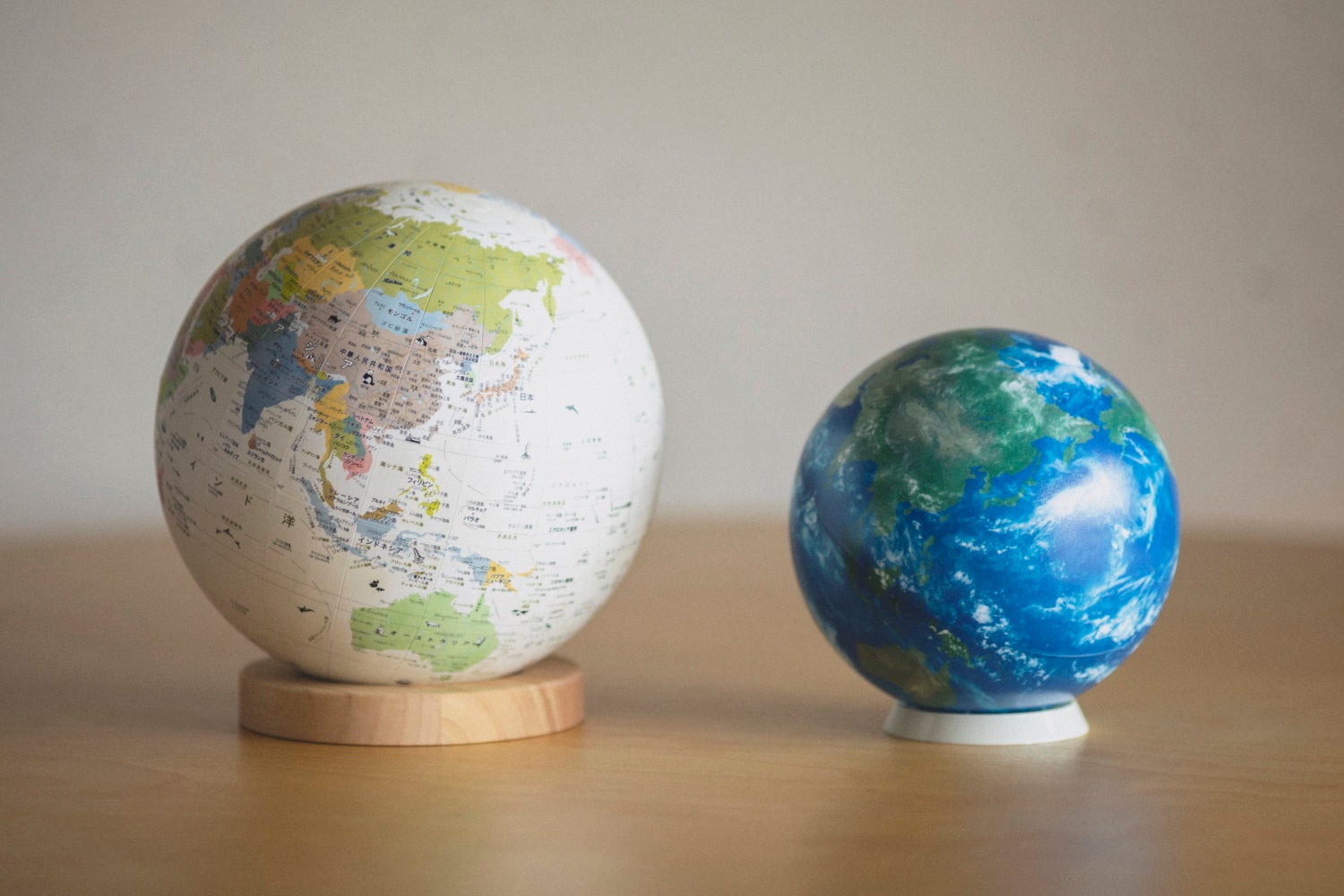「ほぼ日のアースボール」の地球儀本体は2種類。2020年11月発売のメインモデル(画像右)は、国境も国名もない宇宙から見たそのままの姿をした直径15cmの地球儀。2022年7月発売の「ほぼ日のアースボール ジャーニー」(画像左)は、世界の国々をカラフルに塗り分けし、精緻な地図を記載した直径20cmの本格地球儀モデルです。どちらも同じ専用アプリ(無料)でARコンテンツをたのしめます。