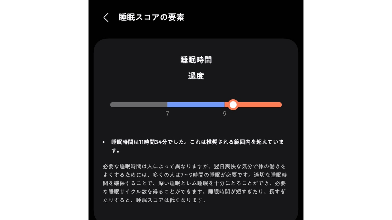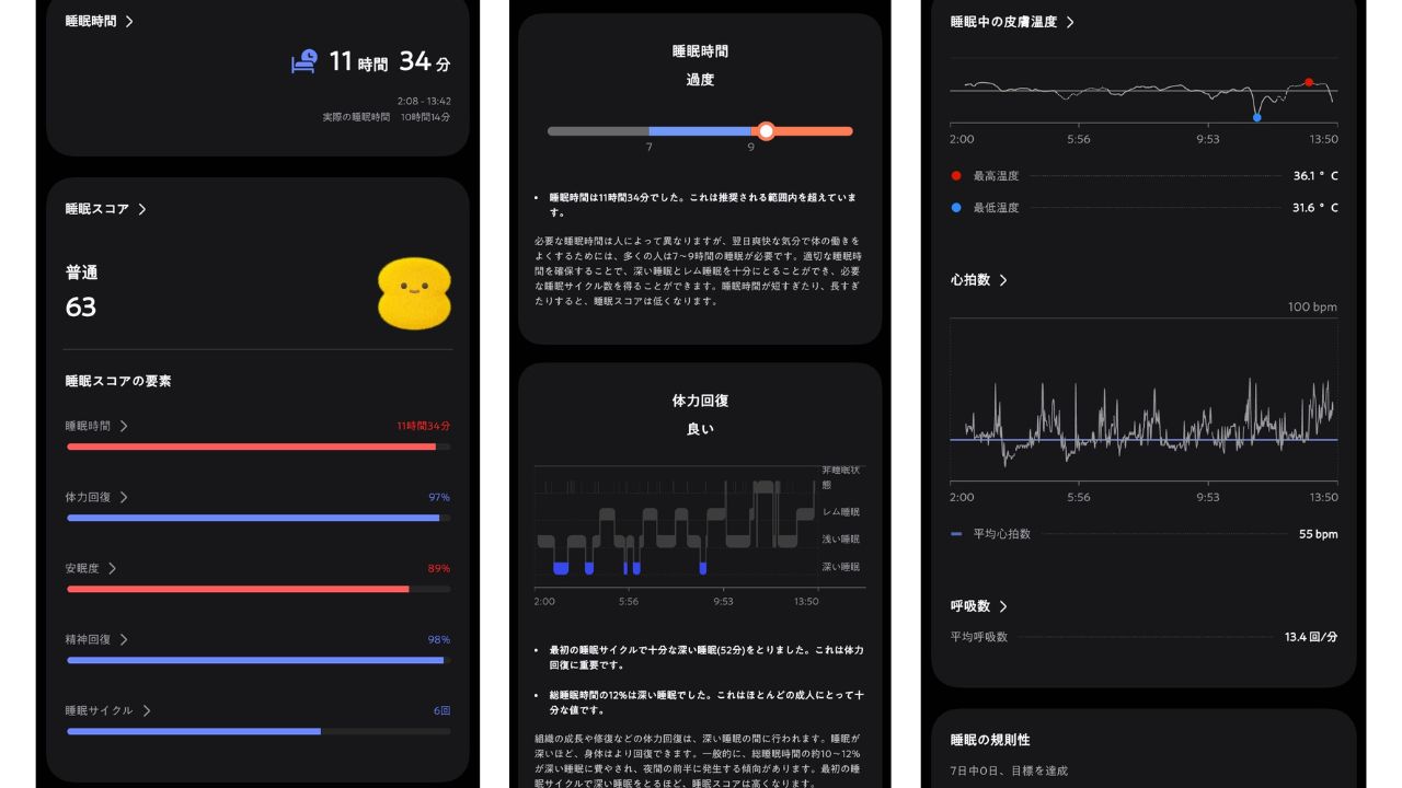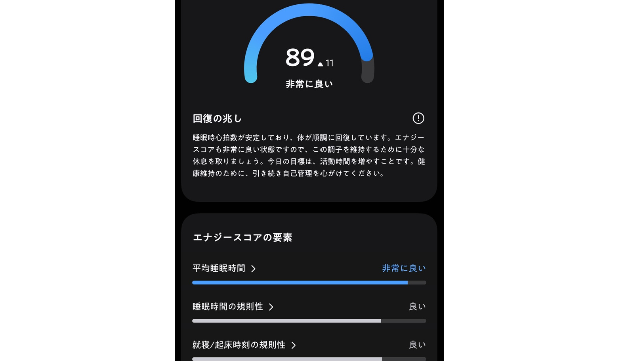 睡眠に関してはかなり詳細にフィードバックしてくれます。100点満点の睡眠スコアから始まり、体力回復や精神回復がどれだけできたかや、深い眠りは何分で浅い眠りは何分かなど、事細かに計測。それぞれの項目で改善案も出してくれるので、睡眠の質向上に役立つはずです。