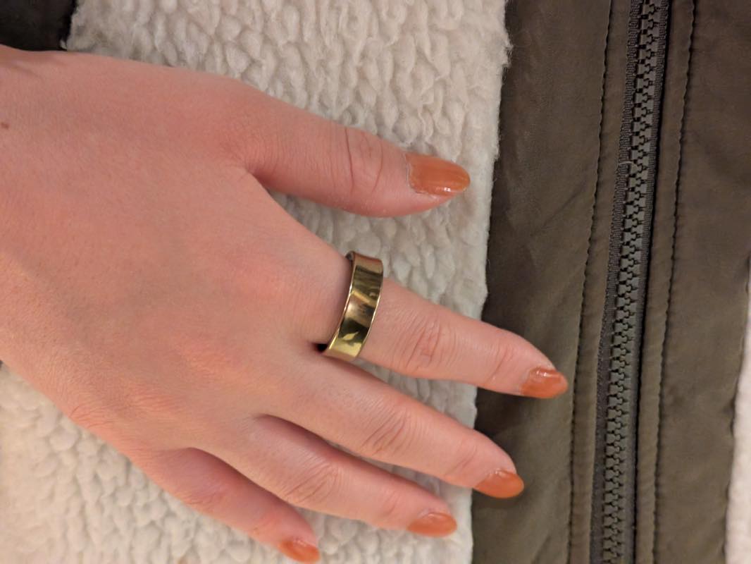 Galaxy Ring本体。今回はゴールドを選択しました。他にはシルバー、ブラックがありますが手持ちのリングがシルバーしかなかったので、あえて少数派のゴールドに。光沢感はかなりあり、装着すると存在感ありまくり。ブラックはマット仕上げなので派手さを抑えたい人はそちらがおすすめです。