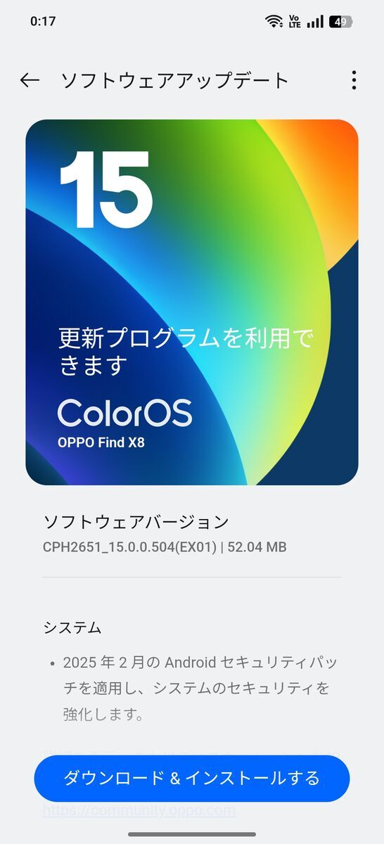 更新ファイルの容量は52.04MB、更新後のビルド番号は『CPH2651_15.0.0.504(EX01)』となります。
