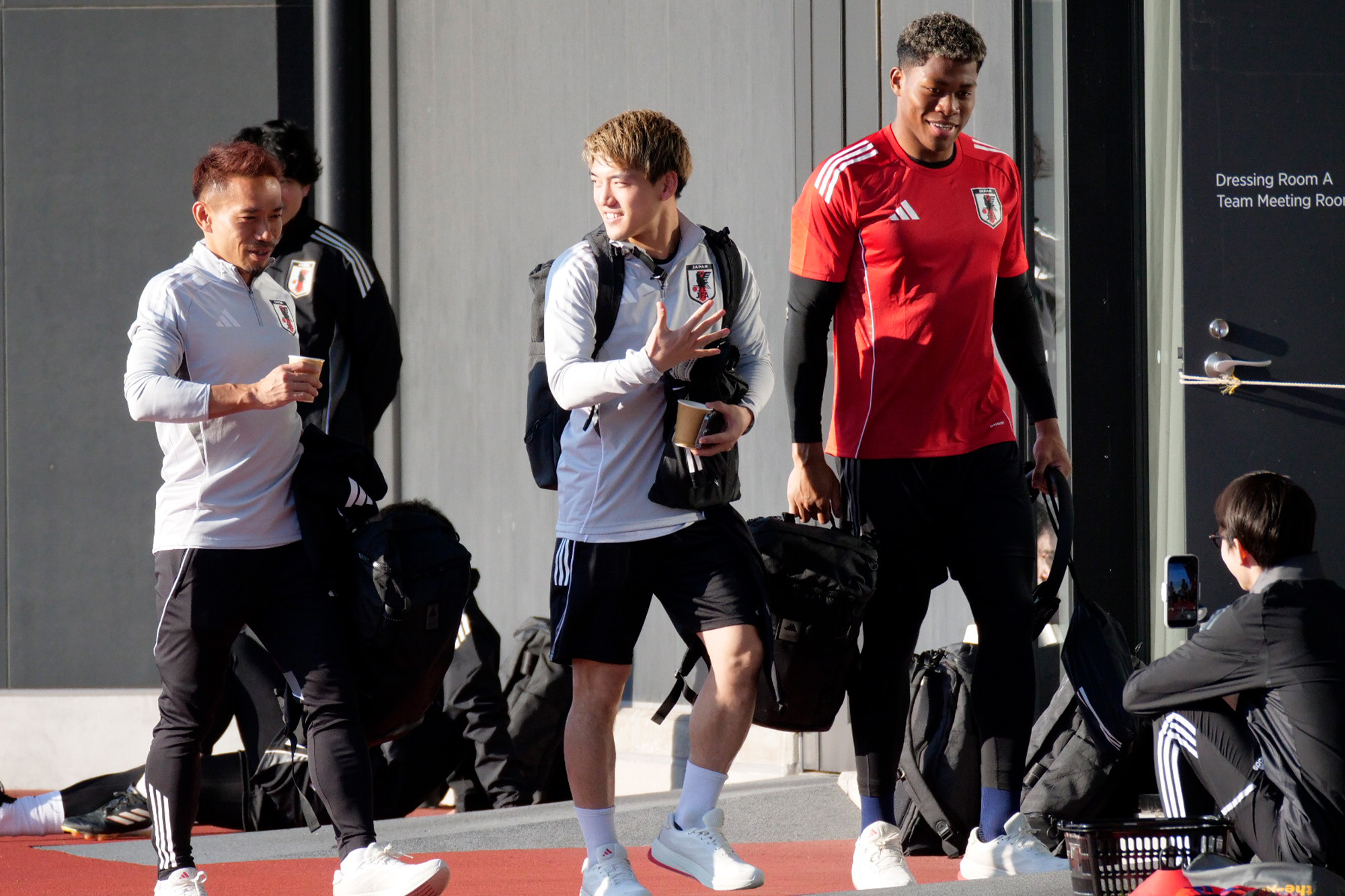 試合前日の公式練習は、筋肉系の炎症で別メニュー調整が続いている長友佑都を除く26名の選手が参加。公開された冒頭15分では、ランニングやストレッチ、ボール回しで体を温めた。打撲の影響で18日(火)の全体練習を欠席していた前田大然もピッチに姿を見せた。
