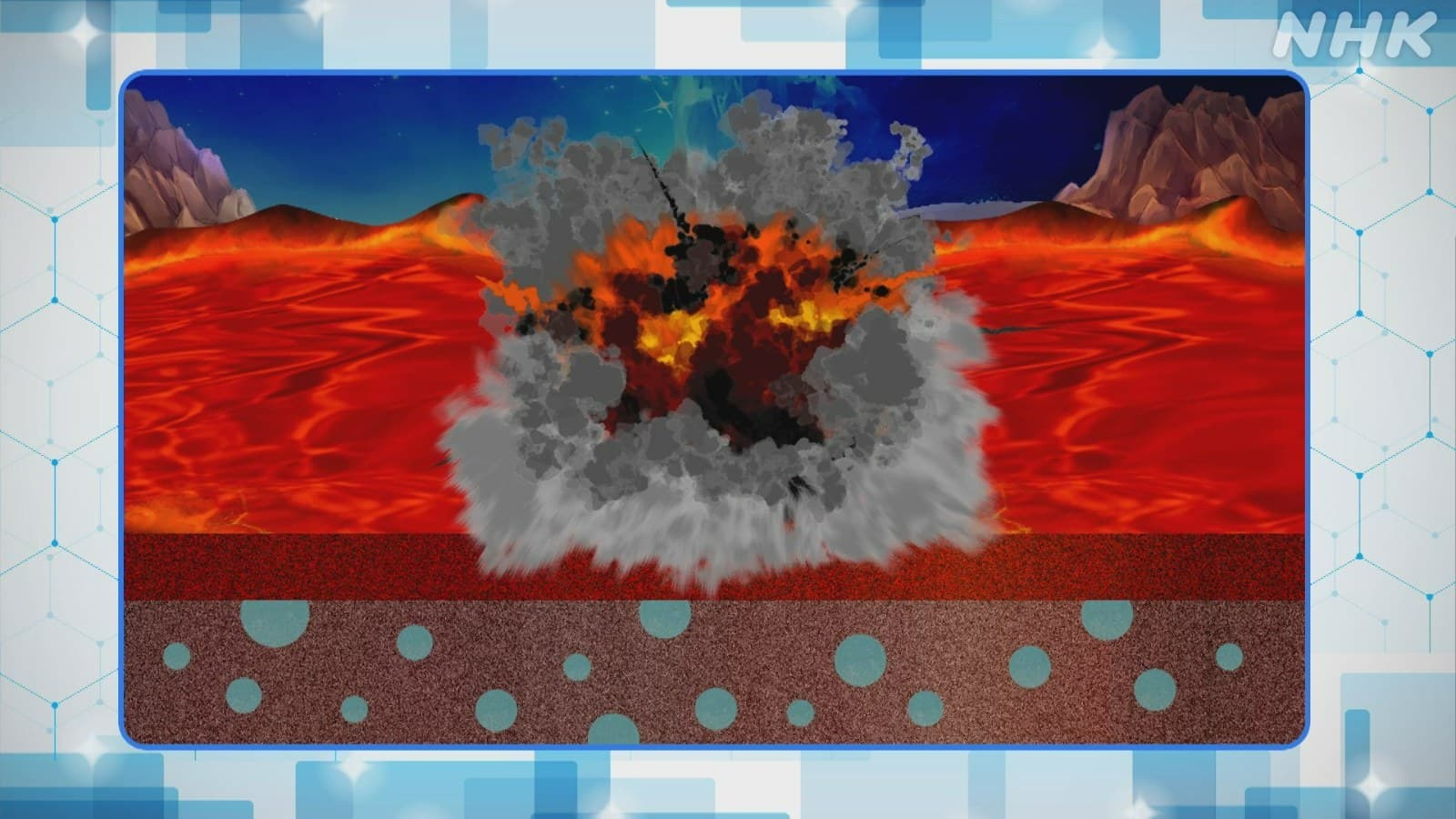 ルートレスコーンのメカニズムです。湖や川など水を含む地面と、高温の溶岩が接することで、水が気化・膨張し爆発が起きます。