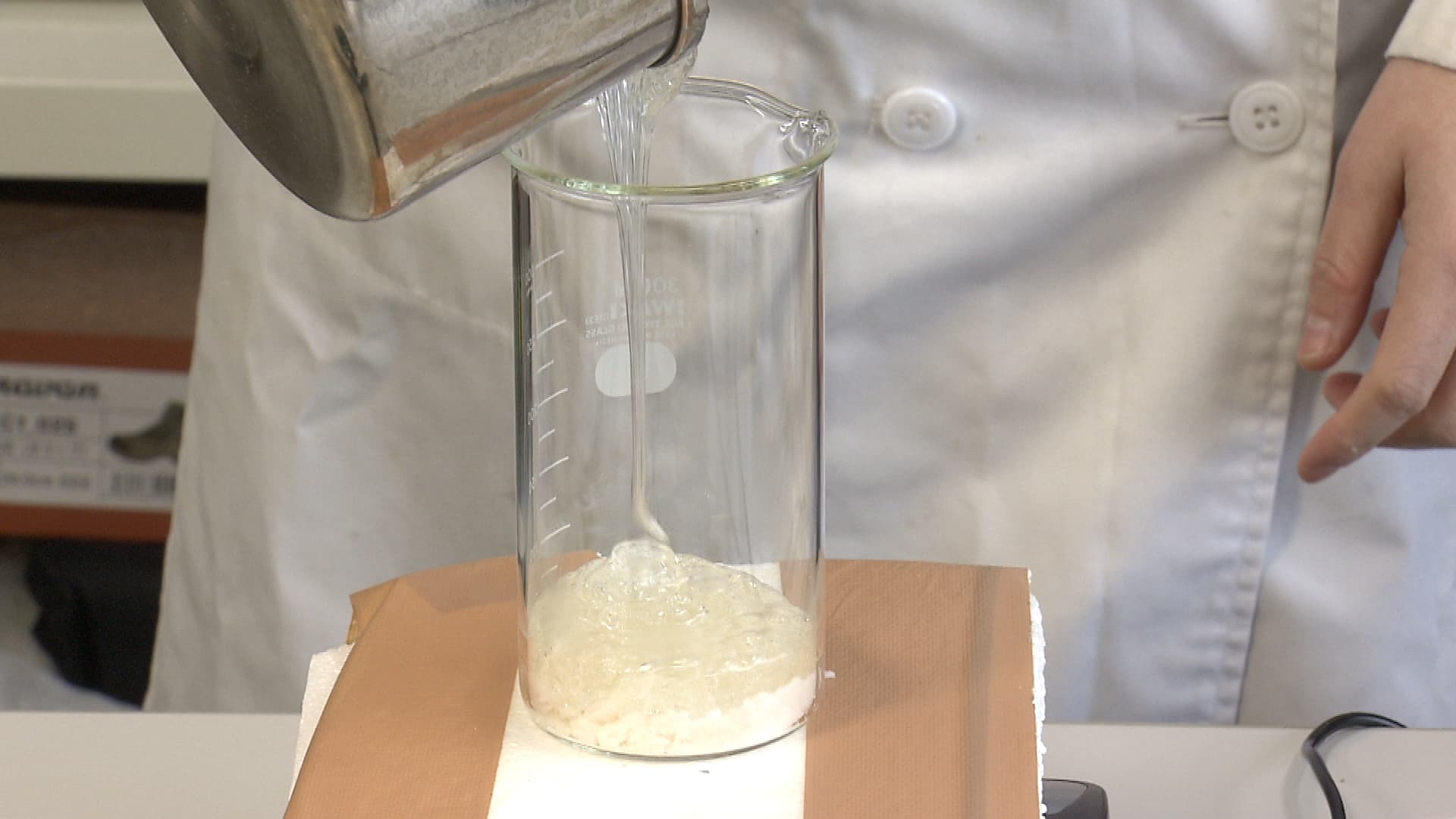 そこに、100℃以上に熱した水あめを注いでいきます。すると・・・。