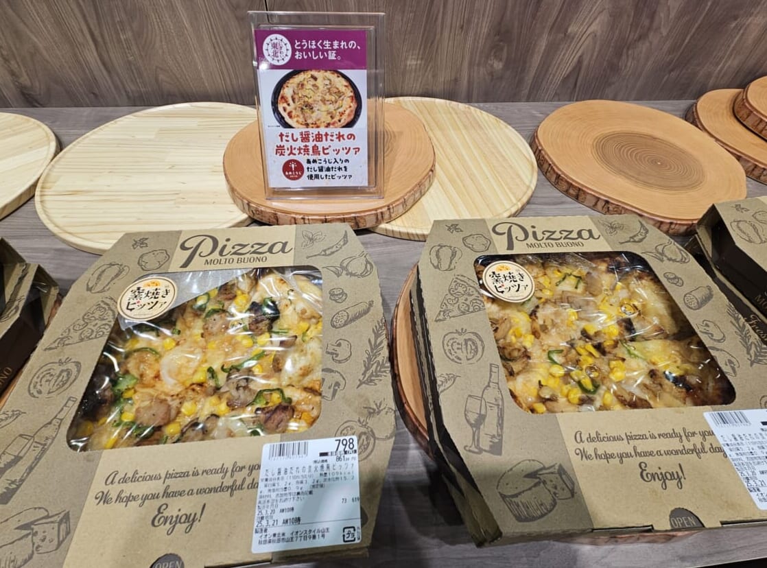 イオンスタイル山王で販売する「だし醤油だれの炭火焼鳥ピッツァ」。あめこうじを使っている